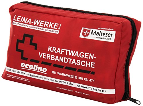 Leina motor vehicle first aid bag Compact + warning vest ecoline red/black/white, with velcro, water resistant nylon fabric sewn with zipper, PVC-free, velcro stripes on the back, content: 1 bandaging material filling according to DIN 13164-2014 inside foil Pocket, 1 warning vest (standardized)