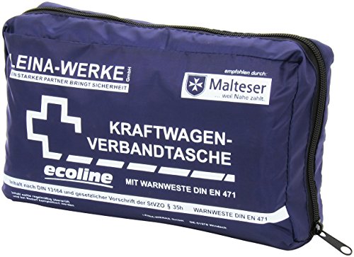 Leina motor vehicle first aid bag Compact + warning vest ecoline blue/white, without velcro, water resistant nylon fabric sewn with zipper, PVC-free, content: 1 bandaging material filling according to DIN 13164-2014 inside foil Pocket, 1 warning vest (standardized)