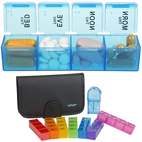 - EASY MEDICATION MANAGEMENT: Easily organize and manage prescriptions, vitamins and supplements for each week with the Vive Pill Case. Eliminating confusion, the compact pill case contains seven color-coded trays with easy to open compartments for managing multiple doses each day. The set also includes a convenient pill splitter to halve large pills, making swallowing easier or under a physician's orders.