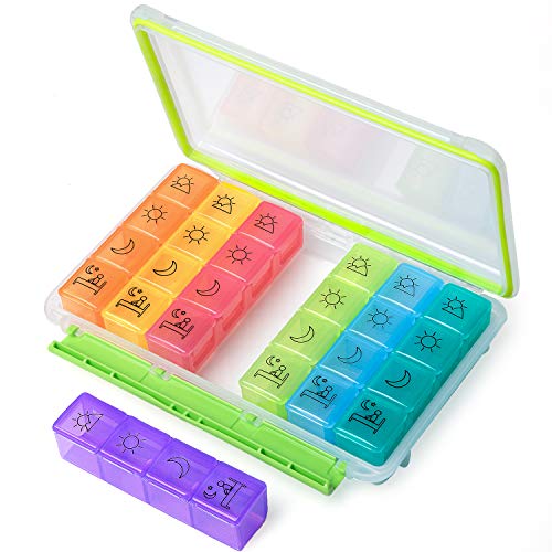 - EASY TO USE: This AM/PM pill organizer with seven colors and early/noon/night/sleeping pattern design is easy to identify; Each row can be carried separately,the imprint on the box will not be easily worn.
